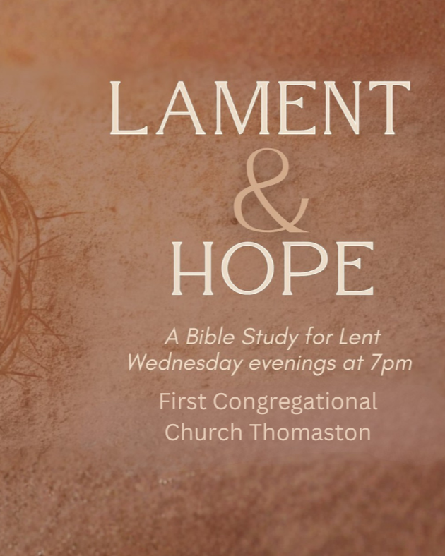 Pastors Marcus, Gordon and Stephanie will be leading a Bible Study during the Lent season on Lament and Hope. We will meet each week in the Fellowship Hall of FCCThomaston 7pm, February 18th-March 25th. We can't wait to see you all there!